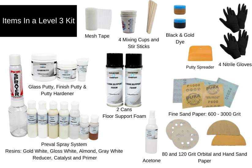 The Kit includes all the materials you'll need to make your damage disappear. Our tub repair system will provide a durable repair that will last indefinitely and save you a lot of money.